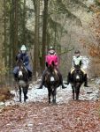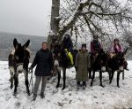 AKTIVITÄTEN » Geritten wird bei uns auf Pferden und Ponys. Aber, wenn es das Gruppentempo zulässt und die Esel gut drauf sind, wird auch mal ein Langohr gesattelt und ab geht die Post ... Dabei darf man die Esel, so gross sie auch sind, auf keinen Fall mit Pferden vergleichen!! Und wer Spaß am tempo- und abwechslungsreichen Reiten hat, wird im Esel keinen passenden Partner finden. Trotzdem ist unser langfristiges Ziel, gesunde und gesund belastbare Großesel zu haben, mit denen man viel Freude bei vielfältigen Aktivitäten hat. Dabei sollte man immer darauf bedacht sein, den eigenen Ehrgeiz dem des Tieres anzupassen und nicht umgekehrt. 2026 - Schneeritt im Januar