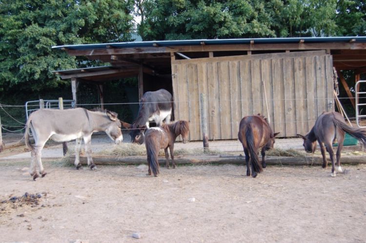 ESELHALTUNG - DER ESELSTALL - Pflege - Bewegung - Beschäftigung - Fütterung - Der Schlaf - Ausrüstung - Hengsthaltung - Eselzucht - Aufzucht - Eselstall - Esel und Pferde- Esel und Gras- schöne Esel Ein guter Eselstall bietet sowohl dem Esel als auch dem Mensch größtmöglichen Komfort. Ein guter Eselstall sollte in der Lage sein, den individuellen Bedürfnissen jedes einzelnen Esels jederzeit angepasst werden zu können. Umgekehrt sollte er so clever geplant sein, dass sich die Stallarbeiten auf ein Minimum reduzieren und man so Zeit gewinnt für die Esel selbst. Das Grundmodell für 2 Grossesel: befestigte Bodenplatte (5x5m) aus Verbundsteinen und Holzstall mit einer Dachbedeckung aus Trapezblech und großen Dachüberstand, da Esel es lieben, trocken zu stehen und trotzdem alles im Blick zu haben. Durch ein leichtes verzinktes Tor (von Patura oder Jourdain) ist der Stall sicher zu schliessen und somit die Möglichkeit gegeben, ein Tier zu separieren, und durch den Dachüberstand stehen auch die anderen Esel trotzdem trocken und sauber. Das Futterlager ist so geplant, dass 2 Rundballen Heu reinpassen und die Esel sowohl aus dem Stall, als auch vor dem Stall fressen könnten. Es ist eine portionierte Fütterung oder eine Fütterung ad libitum möglich. Stallerweiterung durch die Fressgitter ist ein sauberes und angepasstes Füttern möglich. Es können Esel und Pferde jeder Größe dort fressen Der Hengststall besteht aus 3 Abteilungen, davon bestehen 2 Abteilungen aus Box, Paddock und Weide. Der große Laufstall ist multifunktional: er ist - rundherum zu schliessen - in der Mitte abtrennbar, so dass man 2 Gruppen bilden könnte (z.Bsp. mit Weidegang und ohne Weidegang) - in Kürze mit einer Extrabox samt Paddock auszurüsten, sollte ein Tier separiert werden aber nicht alleine stehen - hoch genug, um mit schwerem Gerät zur rangieren - in 10 Minuten gemistet er hat: - Licht und Strom, wichtig für Hufschmied und Tierarzt - beheizte Tränken - Fressgitter für ein sicheres, saubers und gezieltes Füttern - gegen Verbiss Edelstahl-Schienen an allen Kanten - Schiebetore & leichte Tore mit vielen Funktionen - Lamellenvorhang gegen den Wind - und die Morgensonne im Stall Letzte Änderung: 28.01.2025 |