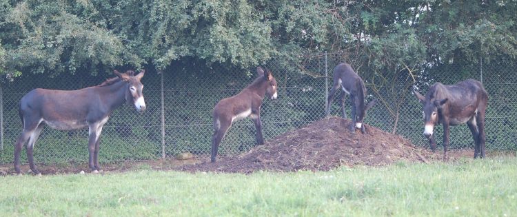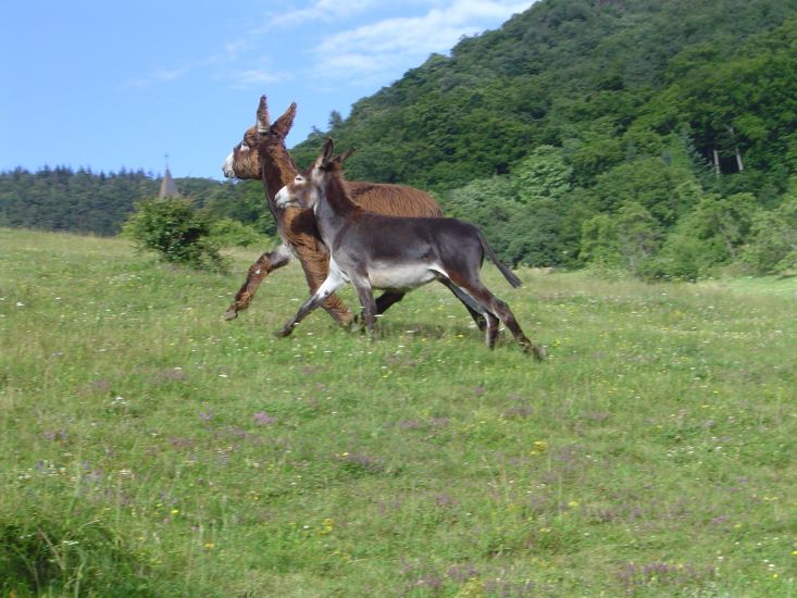 FOHLEN & AUFZUCHT Pflege - Bewegung - Beschäftigung - Fütterung - Ausrüstung - Hengsthaltung - Eselzucht - Aufzucht - Eselstall - Esel und Pferde - Esel und Gras- schöne Esel Heranwachsende Esel müssen die Möglichkeit haben sich geistig und körperlich voll entwickeln zu können. Das hat nichts mit einem vermenschlichten Gefühl, Herdenbildung, Vergleich zu Pferden oder "Glücklichsein" zu tun. Durch das Rumtoben auf der Weide können sich Gelenke, Sehnen, Organe erst optimal entwickeln Diese natürliche Förderung der Durchblutung wird verstärkt, wenn Gleichaltrige dabei sind. Ein gesunder heranwachsender Esel hat einen viel höheren Bewegungsdrang als ein Erwachsener. Genauso wichtig wie die körperliche Entwicklung, ist die Sozialisierung von unseren Esel. Es ist wichtig, das ein Esel alle "Regeln" erlernt, die es im Zusammenleben untereinander gibt und das sind nicht nur positive. Dazu braucht es erfahrene, erwachsene Esel. Zur artgerechten Aufzucht gehört also mehr als nur ein erwachsener Esel als "Kumpel", ganz besonders nach dem Absetzen von der Mutter. Daher sollte man diese Form der Einzelhaltung genauso kritisch betrachten, wie den Rest der Eselhaltung. Diese Entwicklungsfaktoren kann der Mensch weder ersetzen noch ausgleichen! ![]() Eselfohlen/Heranwachsende brauchen: Eselfohlen brauchen ganzjährig freie Bewegungsmöglichkeit auf großen Flächen zur optimalen Entwicklung belastungsfähige Gelenke und eines gesunden Bewegungsapparats. Eselfohlen brauchen andere Fohlen, denn durch Rumtoben, Spielen und um die Wettelaufen wird eine gesunde körperliche Entwicklung gefördert. Eselfohlen brauchen erwachsene Tiere, um das gesamte Sozial- und Ausdrucksverhalten zu erlernen. Eselfohlen brauchen regelmäßig kompetente Hufpflege, um evtl. Fehlstellungen zu korrigieren oder auch gar nicht erst entstehen zu lassen. Eselfohlen brauchen einen intensiveren Entwurmungsintervall. Würmer entziehen dem Fohlen wichtige Nährstoffe und hindern es so an einer gesunden Entwicklung, sie können enorme Schäden in den Organen und bis ins Gehirn verursachen. Die Folgen einer Verwurmung können sich durch das ganze Leben ziehen und können sich auch erst später im Erwachsenenalter bemerkbar machen. Bei Fohlen und Jungesel vermehren sich Würmer besonders schnell, daher ist unbedingt frühzeitig auf die richtige Entwurmung zu achten. Eselfohlen brauchen einen sinnvollen Infektionsschutz, dieser sollte mit dem Tierarzt bespochen werden und sich an den aktuellen Forschungsergebnissen orientieren, denn viele Maßnahmen gelten mittlerweile als überholt. Eselfohlen brauchen eine, auf ihre Bedürfnisse abgestimmte Fütterung. Diese unterscheidet sich von der Fütterung erwachsener Esel und muss viel sorgfältiger bestimmt und umgesetzt werden. Gutes Raufutter muss jederzeit zur freien Verfügung stehen. Eselfohlen und insbesondere Großeselfohlen brauchen sehr proteinhaltiges Aufzuchtsfutter und ein erhöhtes Maß an Mineralien, besonders Calcium. Wer nicht über geeignete Böden verfügt, muss entsprechend zufüttern. Zudem brauchen die Fohlen eine wichtige Grundausbildung (Aufhalftern, Halfterführigkeit, Hufegeben,...), die den ganzen Pflegeaufwand vereinfachen und den Eselkindern eine erste Vorstellung vom Erwachsensein vermitteln. Dementsprechend muss auch die Vorgehensweise beim Erlernen dieser Übungen sorgfältig und behutsam gewählt und durchgeführt werden und vor allem dem Alter des Esels angepasst sein. Frühförderung schon im Baby- bzw Kindergartenalter - muss das sein? Durch ihre Neugierde ist es sehr leicht den Fohlen etwas beizubringen, daher ist man versucht ihnen möglichst viel beibringen zu wollen. Ob das allerdings sein muss, steht und fällt mit dem eigenen menschlichen Ermessen. Ein gut sozialisierter Esel dem man die Kindheit lässt und nicht vom ersten Tag an zum Befehlsempfänger erzieht, wird auch noch später schnell und freudig lernen. Schmuse- und Streicheleinheiten dürfen natürlich nicht zu kurz kommen, allerdings wissen manchmal kleine Esel genauso wenig wie kleine Kinder wann sie zu weit gehen und sie zu wild werden. Da muss konsequent geblieben werden, denn es wird weder gebissen noch getreten - auch nicht im Ansatz, auch nicht als noch so süßes Fohlen. Diese Bedingungen müssen Eselfohlen im ersten Lebensjahr uneingeschränkt zur Verfügung stehen, im optimalen Fall aber mindestens bis zum 2. Lebensjahr und natürlich darüber hinaus. hier geht es zu Tipps Rund um die Fohlengeburt. ![]() nach dem Absetzen: der Trennungsschmerz von der Mutter lässt sich gemeinsam besser verkraften. Das Absetzen bei Stutfohlen erfolgt frühenstens mit 10 Monaten und spätestens nach einem Jahr, Hengstfohlen mit 7-8 Monaten. ![]() egal ob Grosseselfohlen oder normales Eselfohlen: gesunde Fohlen Toben, Spielen und Laufen gerne und viel, der Schalk sitzt ihnen hinter den viel zu großen Ohren und ständig gibt es etwas neues zu entdecken. ![]() Der Bewegungsdrang von heranwachsenden Eseln ist viel größer, als der Erwachsener. Daher ist es unbedingt notwendig, dass Eselkinder gleichaltrige Spielgefährten haben. ![]() ![]() ![]() Hügeliges Gelände fördert durch ständiges bergauf und bergab laufen eine optimale körperliche Entwicklung. ![]() Schmuseeinheiten dürfen zwar nicht fehlen, aber der Mensch kann die wichtigsten Bedürfnisse weder ersetzen noch ausgleichen. Seine Aufgabe besteht darin, den Fohlen alle notwendigen Bedingungen zur optimalen Aufzucht zu schaffen. ![]() ![]() ![]() ![]() Die wichtigste Bindung besteht zur Mutter. Sie ist der beste Lehrmeister und daher sollte es den Fohlen ermöglicht werden, solange wie möglich bei ihren Müttern zu bleiben. Allerdings darf der Schritt in die Selbständigkeit nicht verpasst werden. ![]() ![]() ![]() ![]() ![]() ![]() Taori und Tzara ![]() ![]() ![]() ![]() Fohlen brauchen ganzjährig freie Bewegungsmöglichkeit auf grossen Flächen zur optimalen Entwicklung belastungsfähige Gelenke und einem gesunden Bewegungsapp